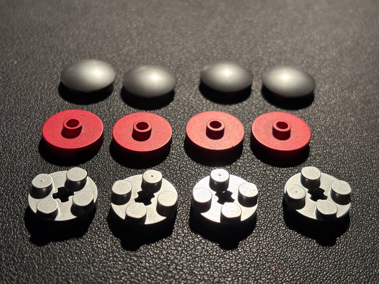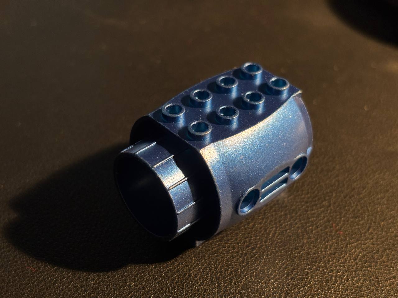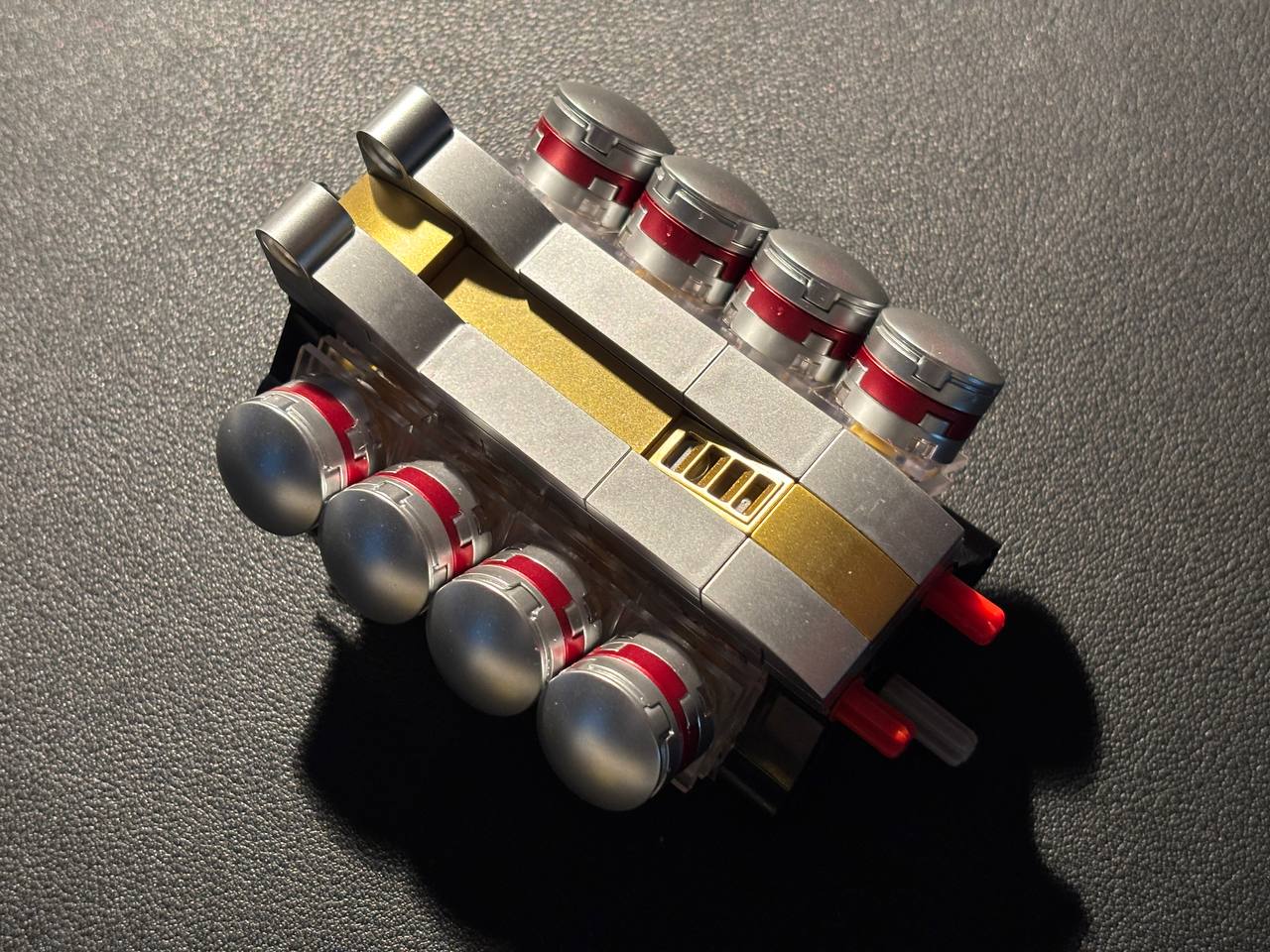 So sieht der erste Teil mit den stilisierten Zylinderköpfen und den schon angesprochenen metallic-rot glänzenden Teilen zusammengebaut aus… die obere Zylinderreihe im nächsten Schritt mit den silbernen Teilen wieder zuzumachen, ist fast schon dekadent.