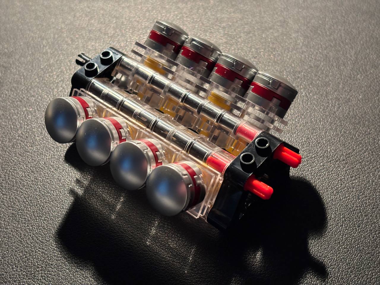 Hier nun der zusammengebaute Motorblock… so schon ein echtes Schmuckstück mit den sich bewegenden Kolben (das kennt man so schon seit geraumer Zeit auch von anderen vergleichbaren Modellen), aber die glänzenden stilisierten Zylinderköpfe machen schon was her.