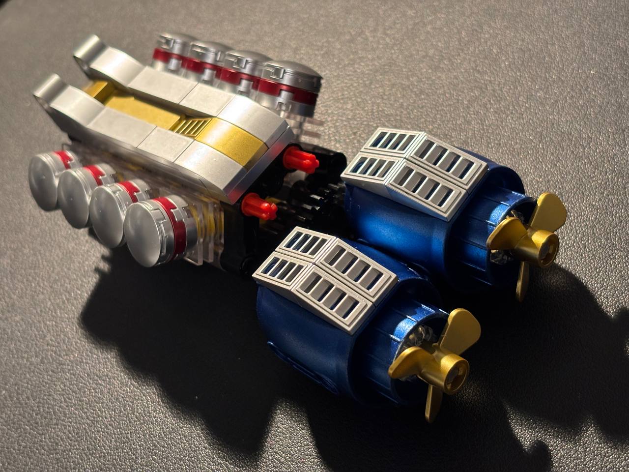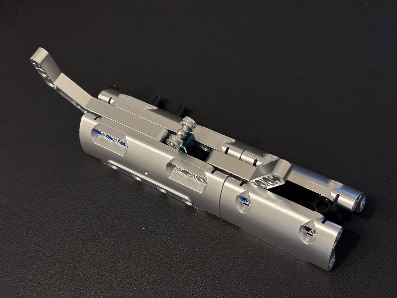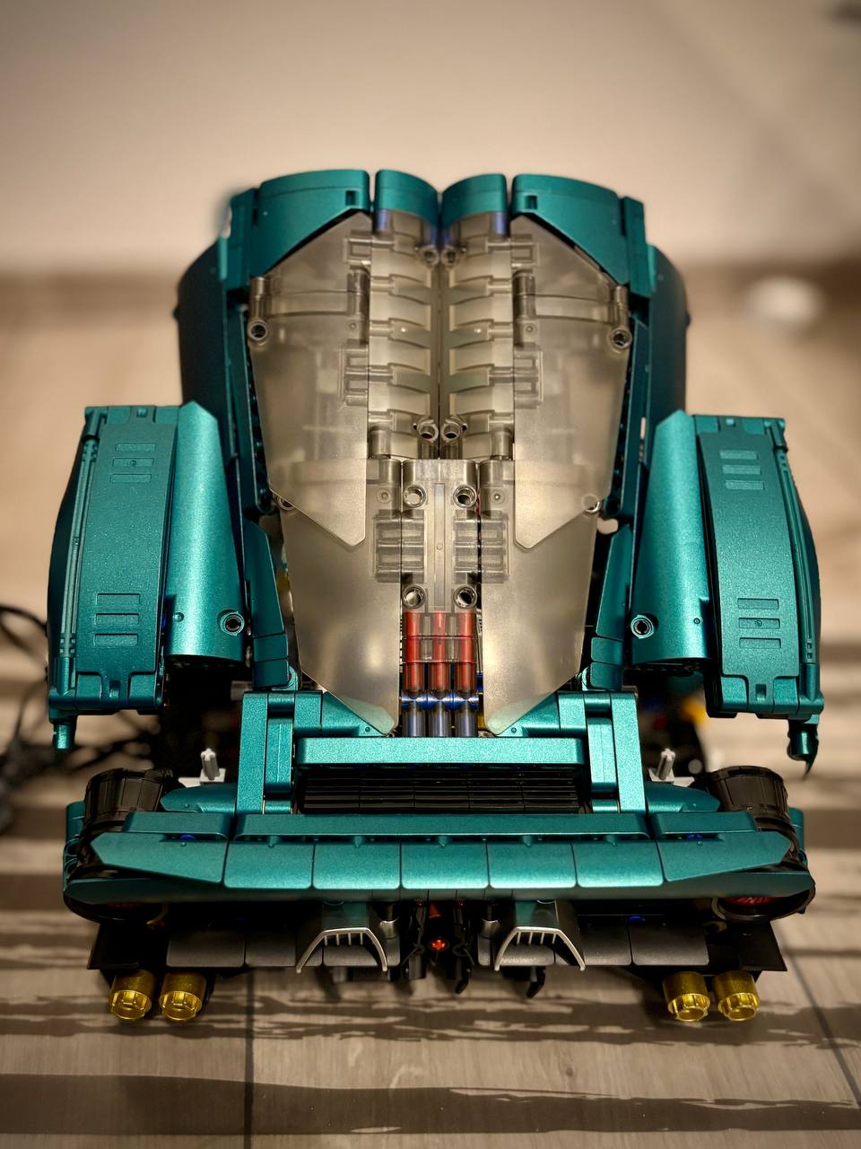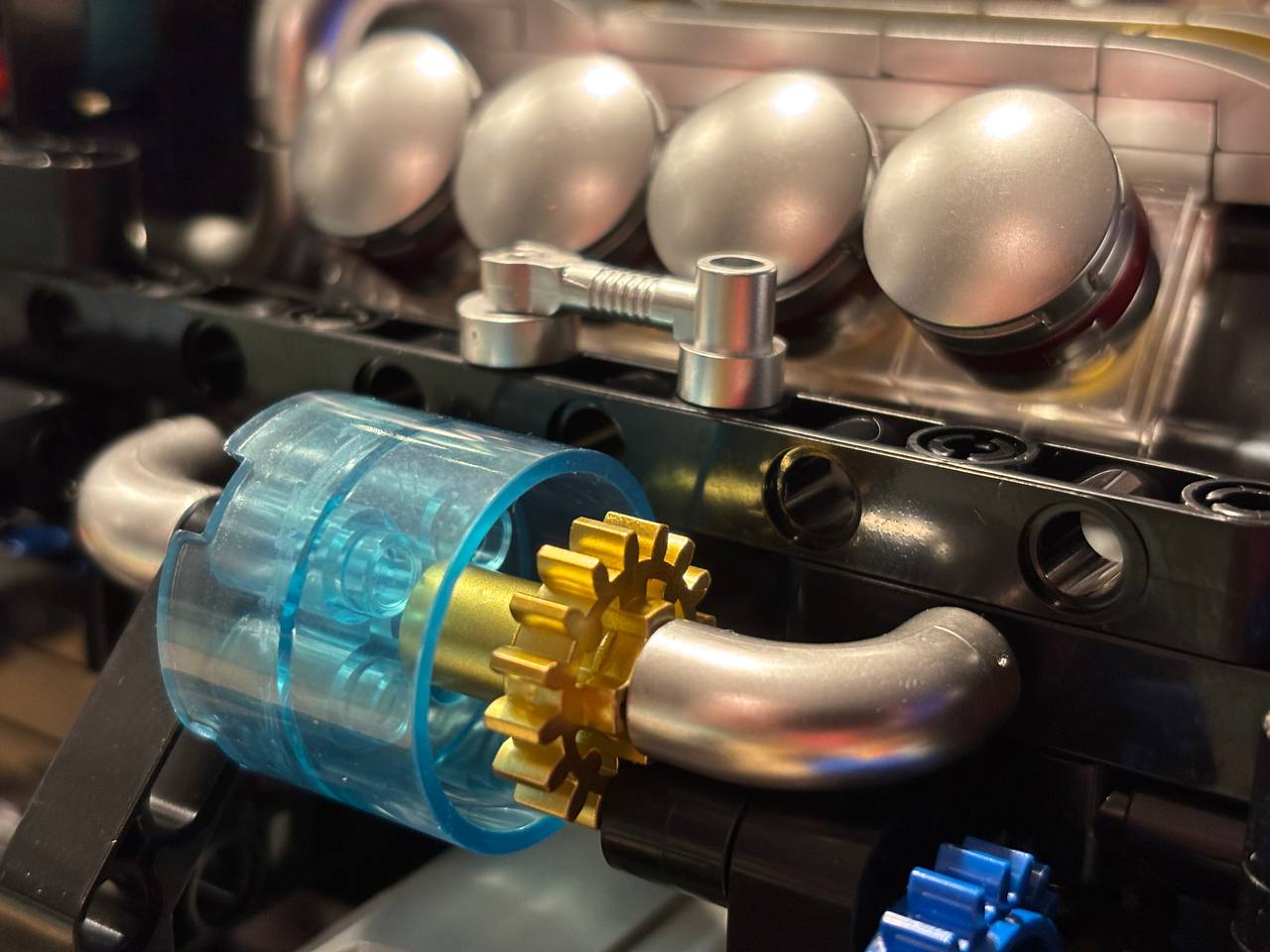 Weiter geht’s mit noch ein paar spannenden Details: dass bei all den silber-metallic Teilen auch die rechtwinkligen „Luftröhren“ metallisch glänzen, war ja schon fast klar. Goldenes Zahnrad und v.a. die transparent-blauen Teile sind gleichzeitig dann doch nochmal ein Hingucker.