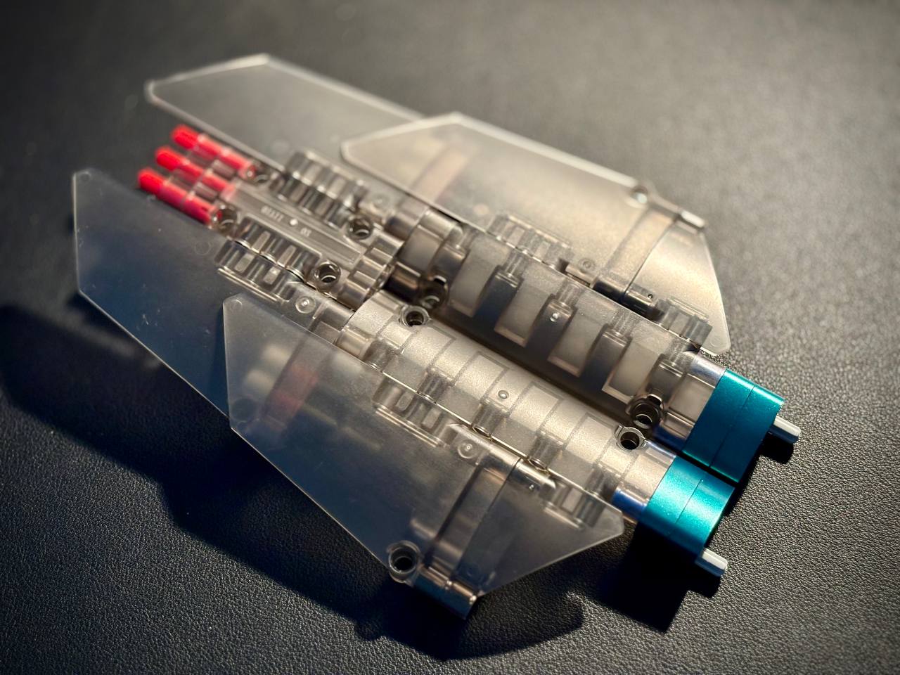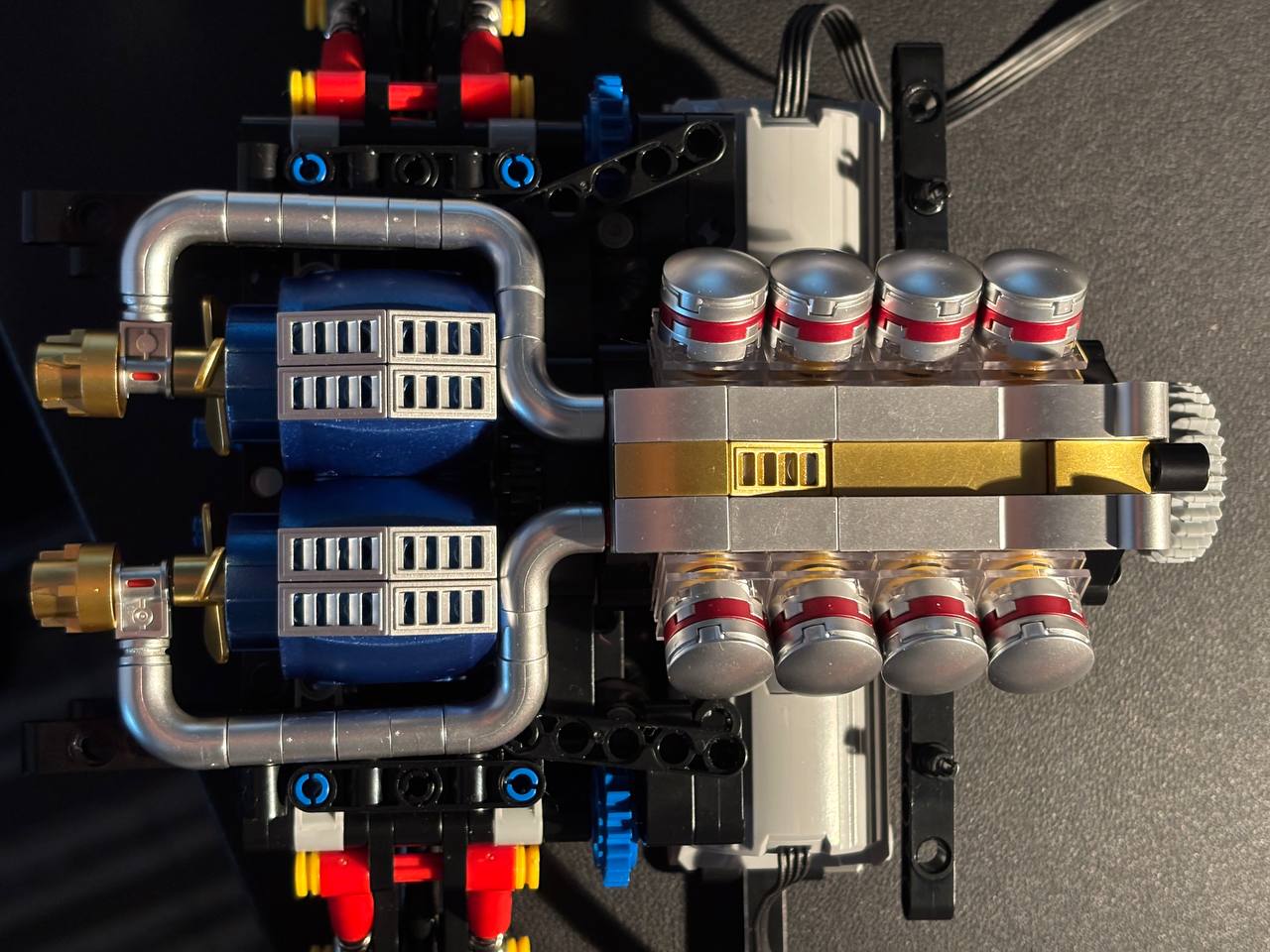 Eingebaut in das Chassis und mit wiederum metallisch glänzenden Propellern, Ladeluftleitungen und dem Twin-Turbo sieht das wahrlich beeindruckend aus.
