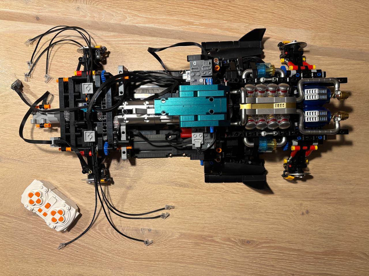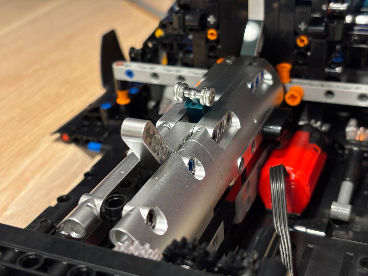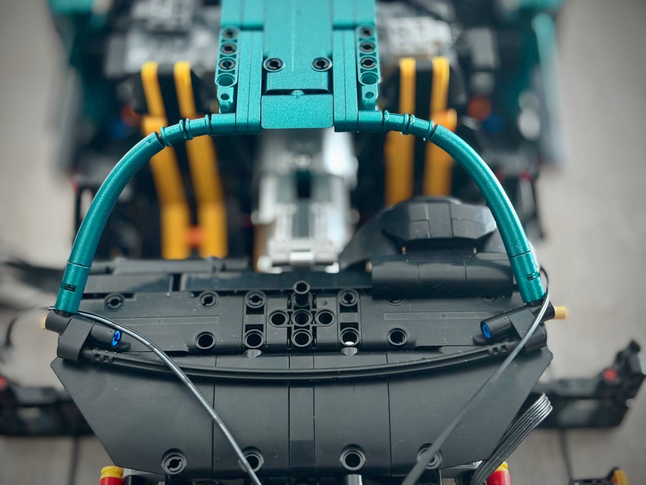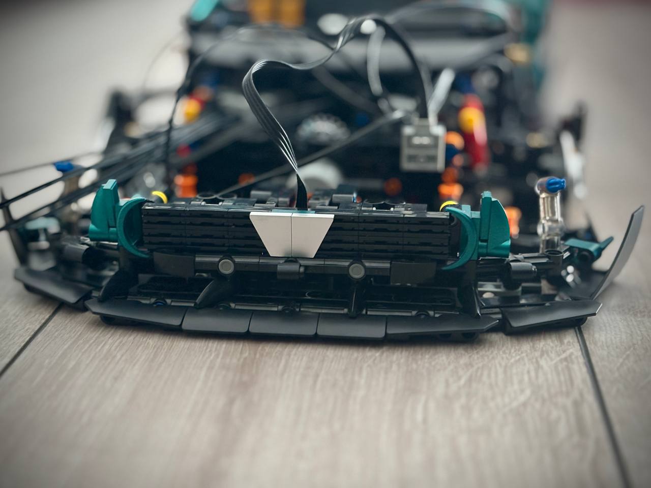 Jetzt kommen wir aber mal zum Verbesserungspotential bei diesem Modell: das mit dem Kabelmanagement war ja bereits erwähnt… die Idee, die Kabelverlängerung rechts vorne am Liftarm zu fixieren, fand ich eigentlich ganz gut. Leider wurde das im weiteren Verlauf des Baus obsolet, da der Platz von der Motorhaube (wenn davon bei einem Mittelmotor die Rede sein kann) benötigt wird.