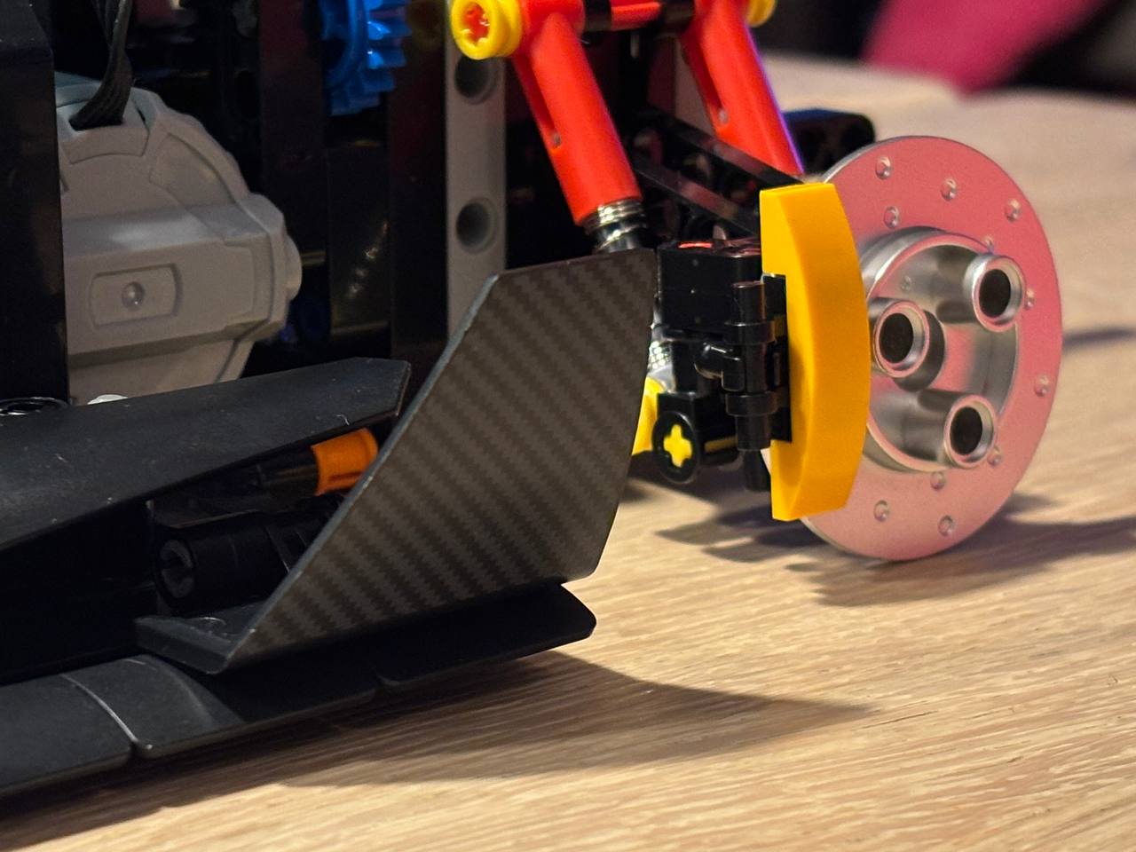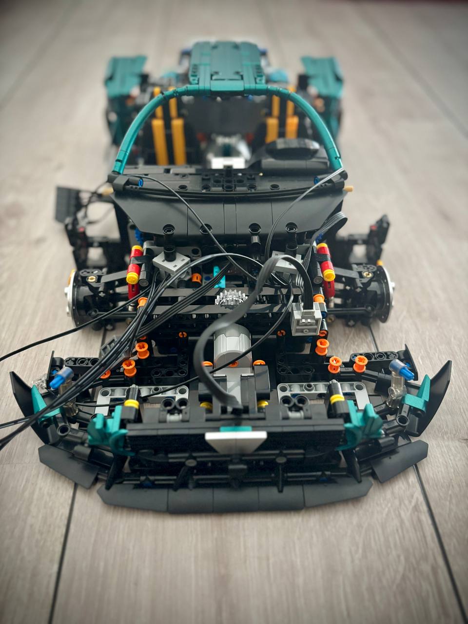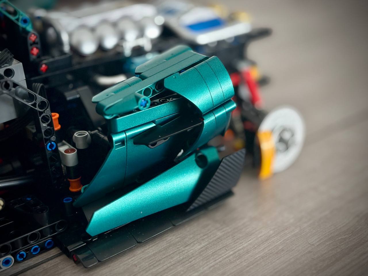 Jetzt kommen wir aber mal zum Verbesserungspotential bei diesem Modell: das mit dem Kabelmanagement war ja bereits erwähnt… die Idee, die Kabelverlängerung rechts vorne am Liftarm zu fixieren, fand ich eigentlich ganz gut. Leider wurde das im weiteren Verlauf des Baus obsolet, da der Platz von der Motorhaube (wenn davon bei einem Mittelmotor die Rede sein kann) benötigt wird.