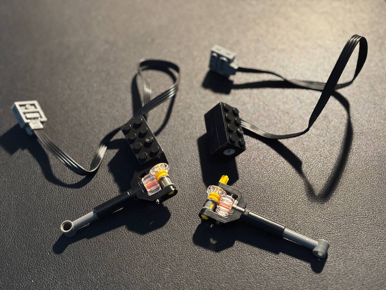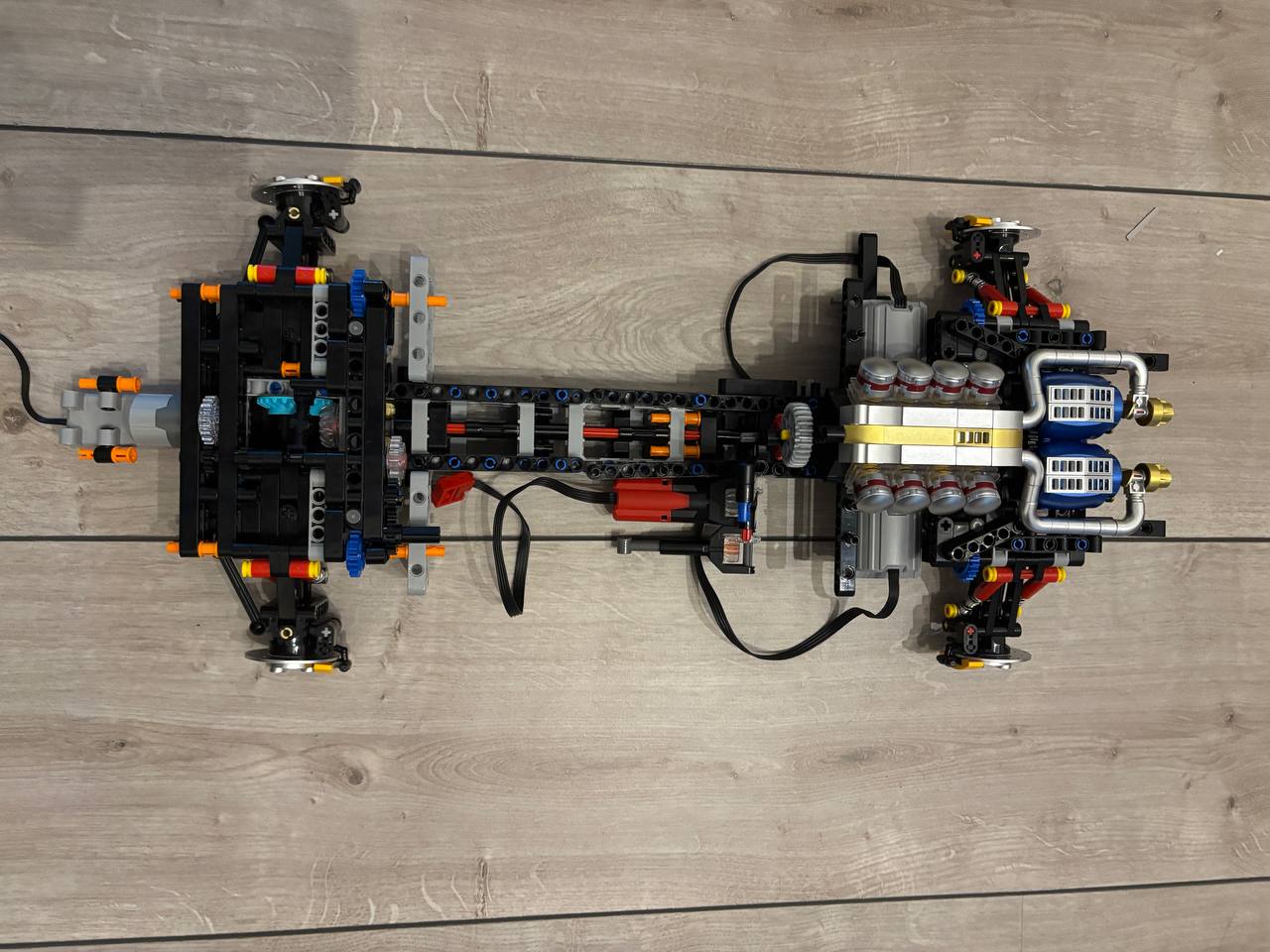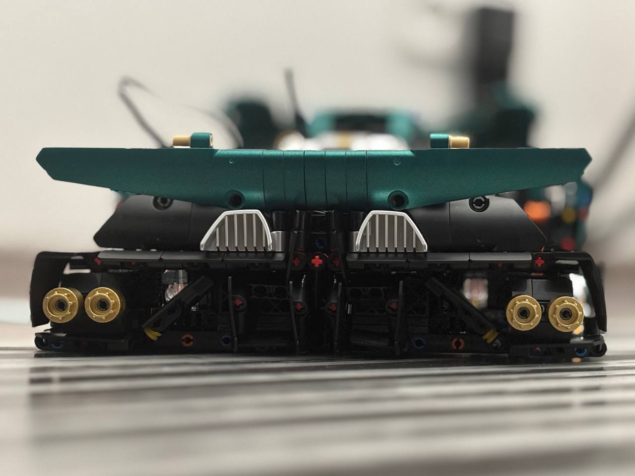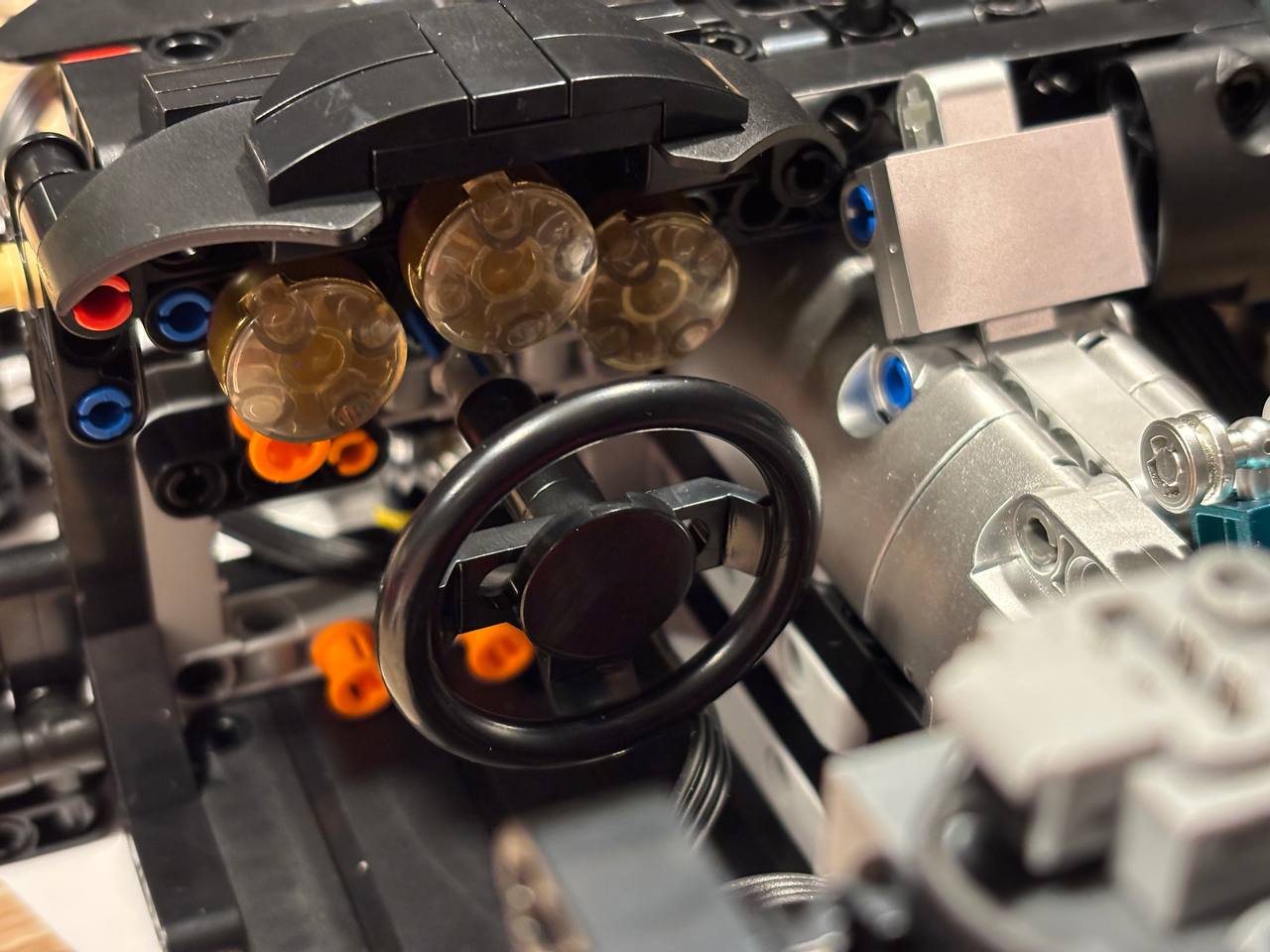 Jetzt kommen wir aber mal zum Verbesserungspotential bei diesem Modell: das mit dem Kabelmanagement war ja bereits erwähnt… die Idee, die Kabelverlängerung rechts vorne am Liftarm zu fixieren, fand ich eigentlich ganz gut. Leider wurde das im weiteren Verlauf des Baus obsolet, da der Platz von der Motorhaube (wenn davon bei einem Mittelmotor die Rede sein kann) benötigt wird.