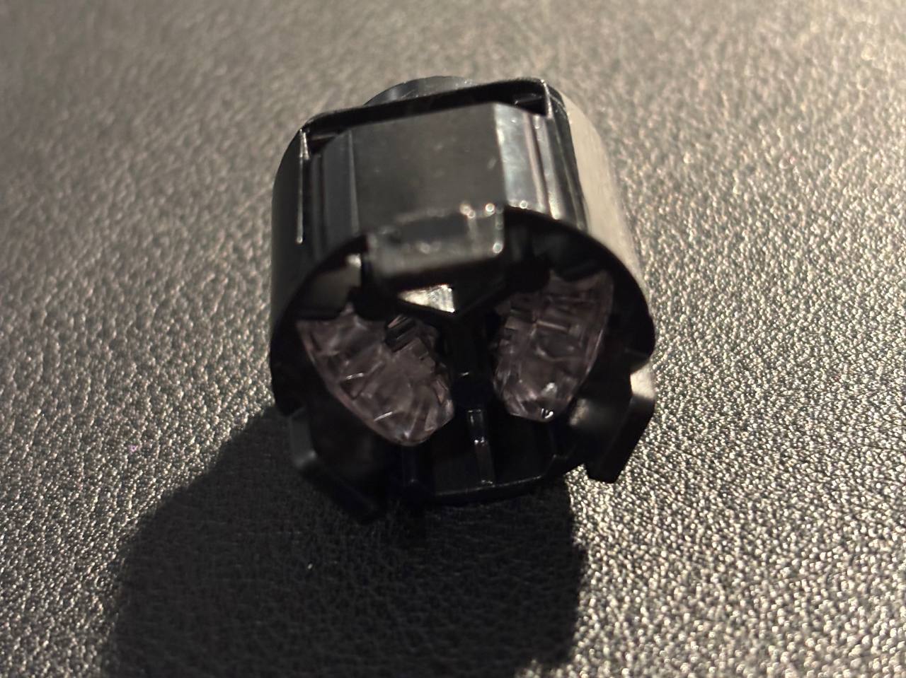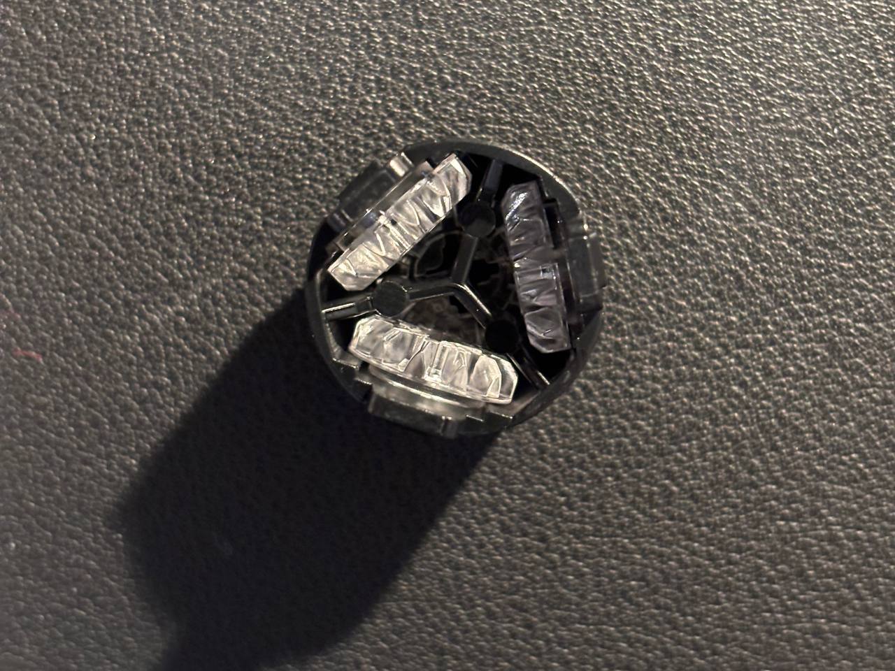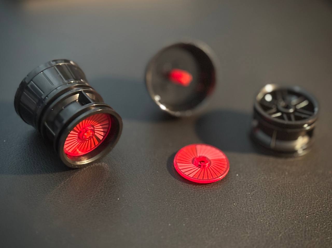 Jetzt geht’s an die Rücklichter und die sind auch interessant konstruiert: was bei anderen Modell als Felgen verwendet wird, bildet hier die Aufnahme für eine rot geriffelte Scheibe, diesmal leider ohne LEDs.