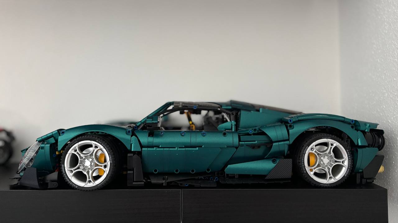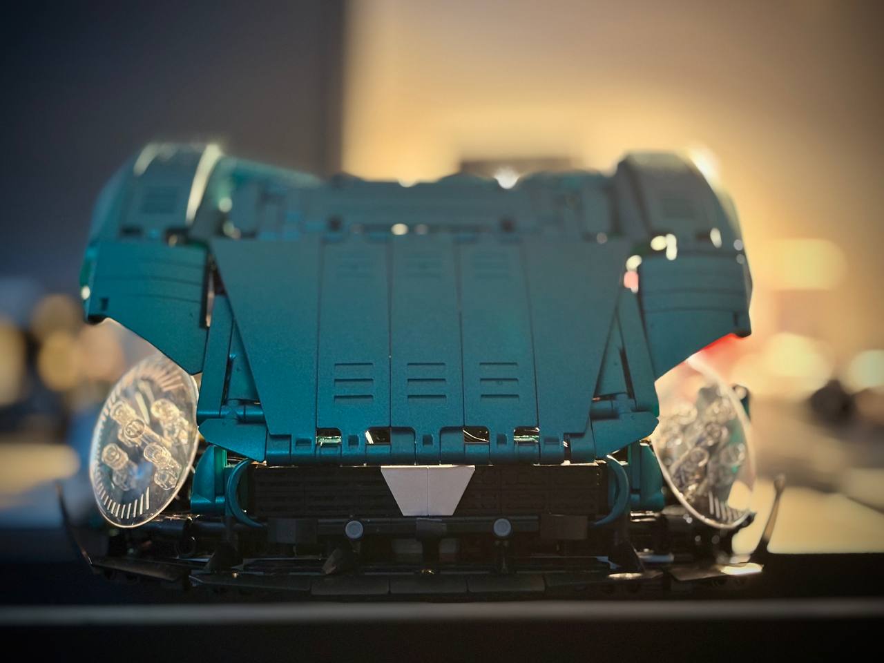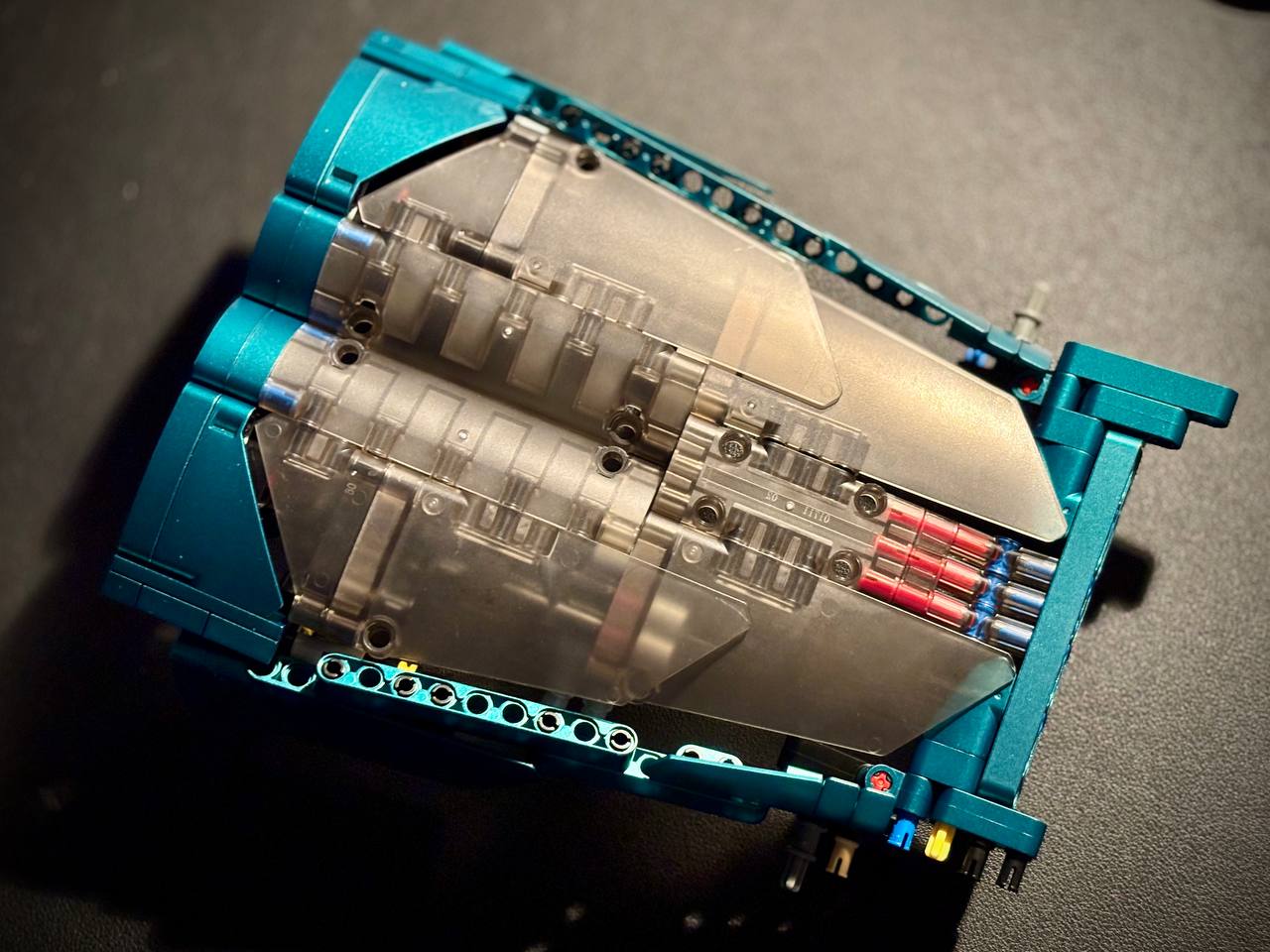 Im nächsten Bauabschnitt, in dem die Haube am Heck (also die eigentliche Motorhaube) gebaut wird, wartet schon wieder eine Besonderheit: das Original hat eine Glashaube, um freien Blick auf den Motor zu bieten. Während andere Modelle hier gerne einen Rahmen bauen und den Rest einfach leer lassen, werden bei diesem Set einfach kurzerhand alle relevanten Teile, wie hier die Paneele, transparent ausgeführt.