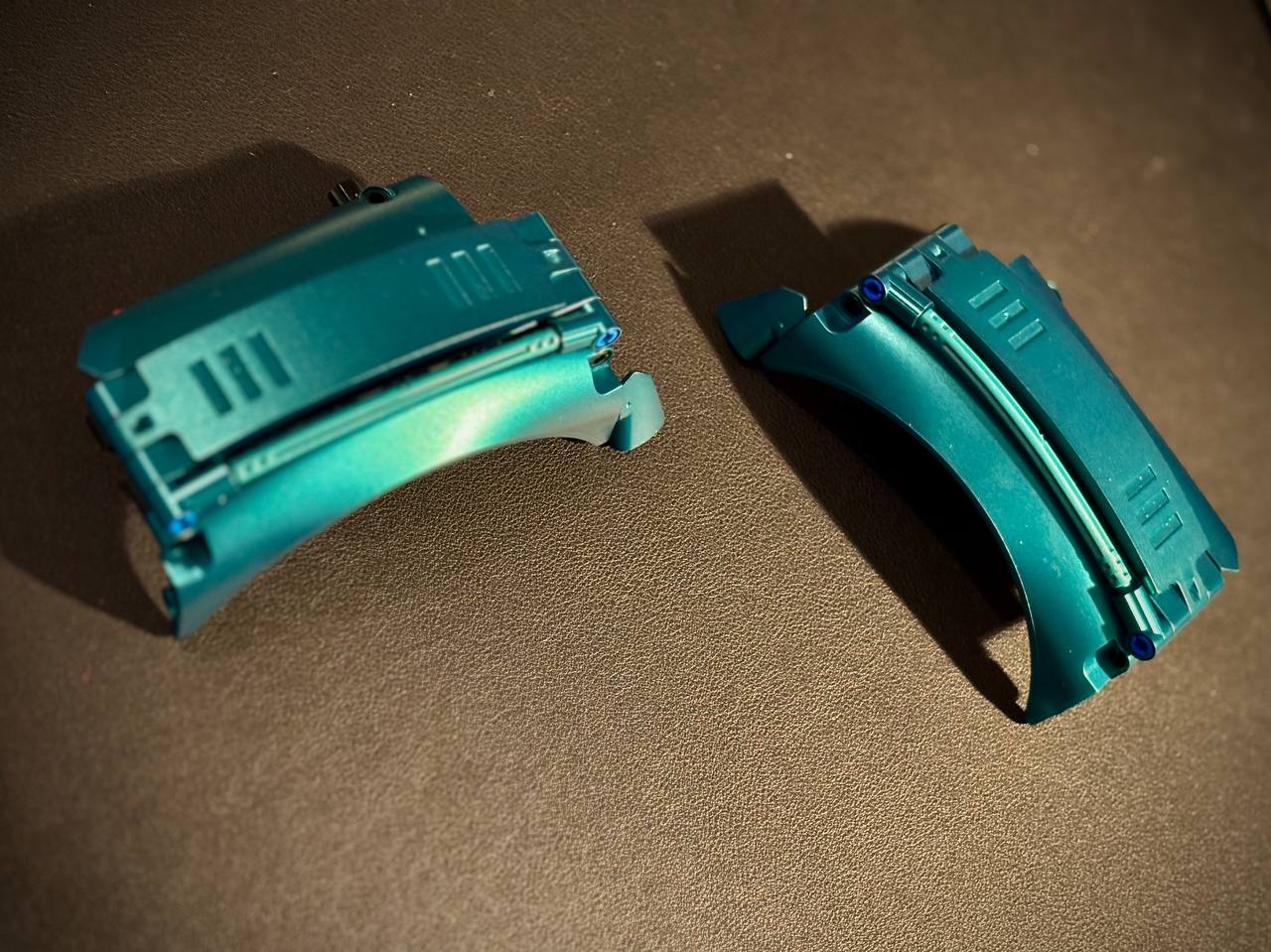 Weiter geht’s im nächsten Bauabschnitt mit der Karosserie und hier den seitlichen Lufteinlässen. Ich war ja skeptisch, was die grüne Farbe angeht… muss aber zugeben, dass der Grünton mit dem Metallic-Look doch auch ausgesprochen gut ausschaut.
