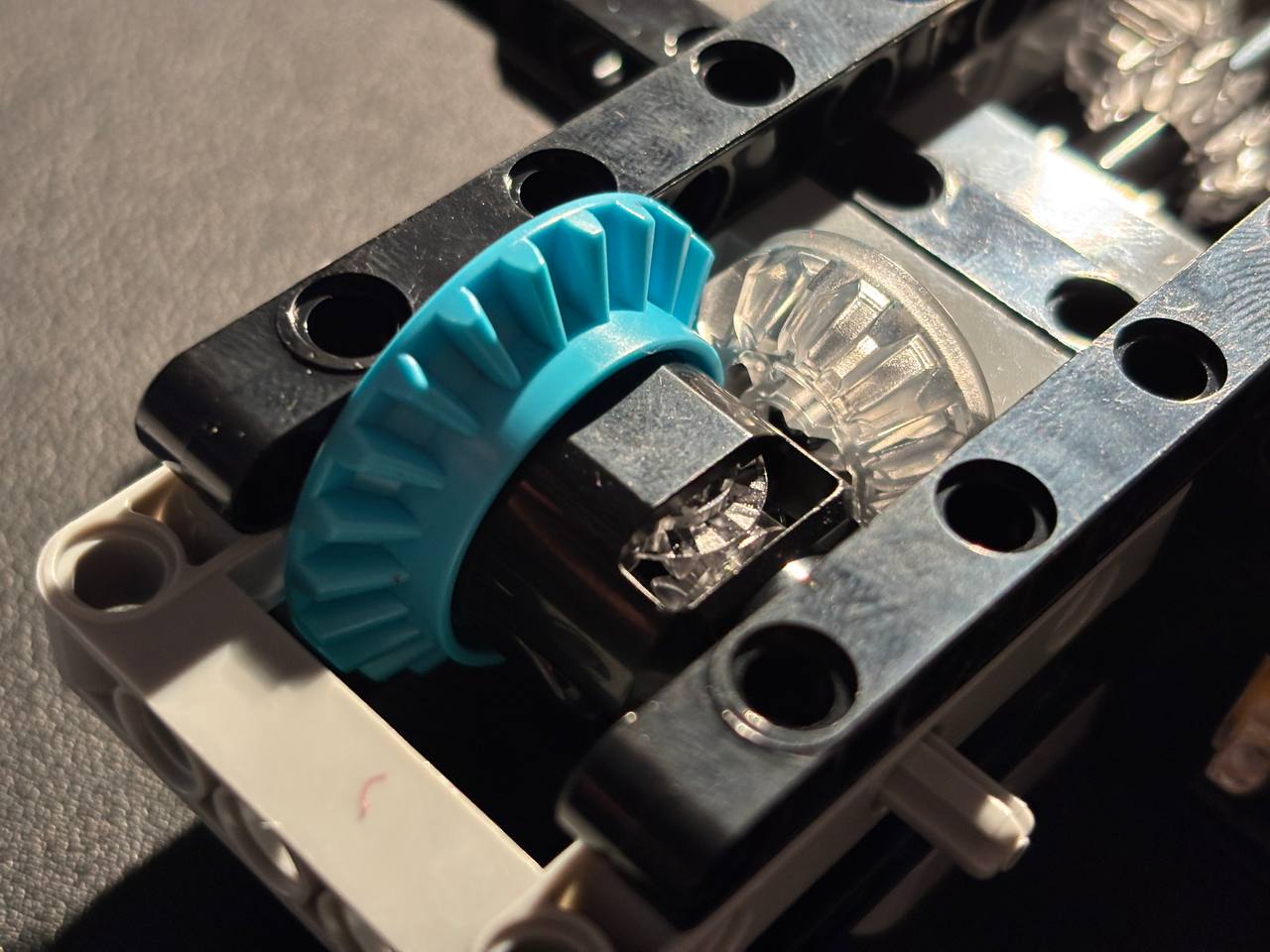 Zuletzt kommt das 5. Zahnrad „als Deckel“ oben drauf, so dass alle 5 Zahnräder sauber ineinander greifen und sich v.a. nicht verkanten.