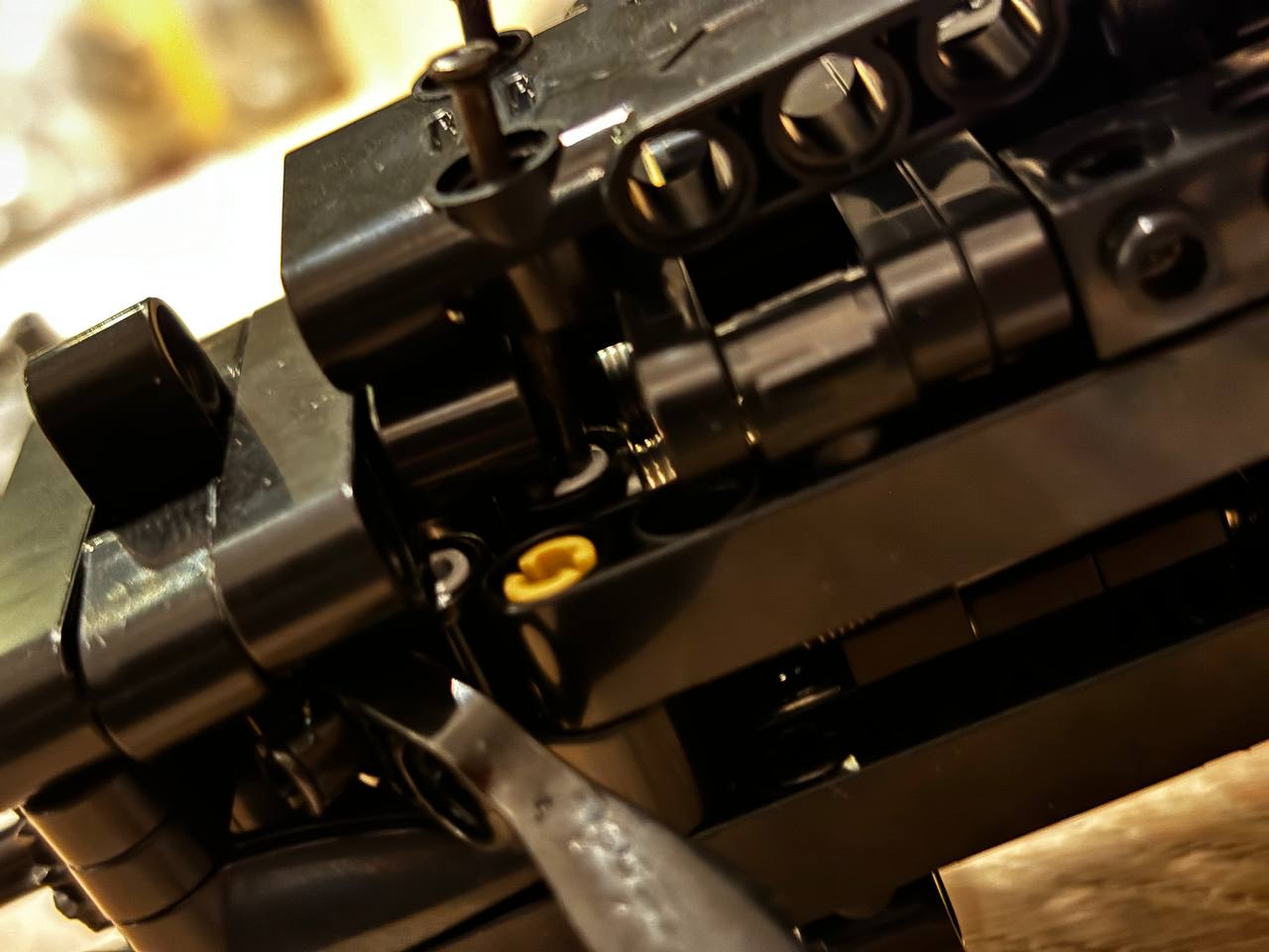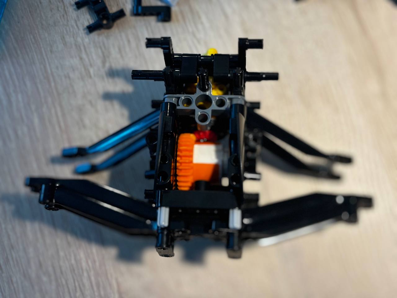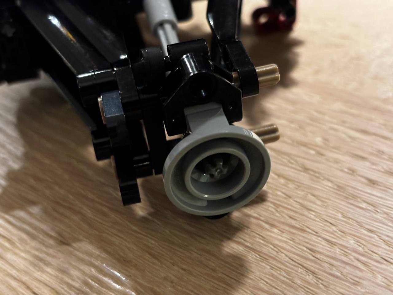 Dadurch werden die Federbeine so weit zusammen gedrückt, dass sie nicht mehr an das durch den grauen Pin fixierte zylindrische Bauteil ragen, sondern sogar hinter den beige-braunen Pin an der äußeren Halte-Konstruktion des Chassis zurück gedrückt werden.