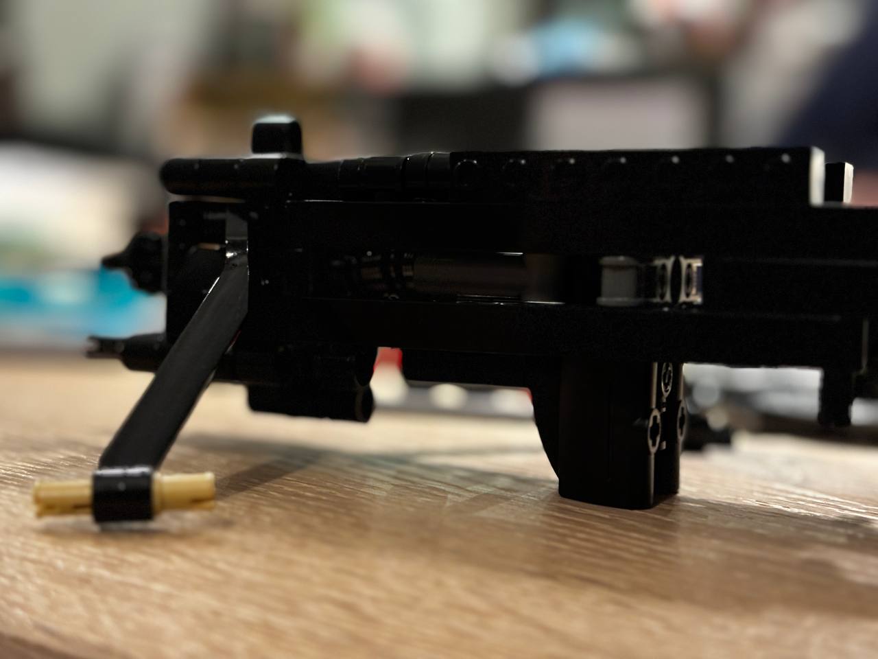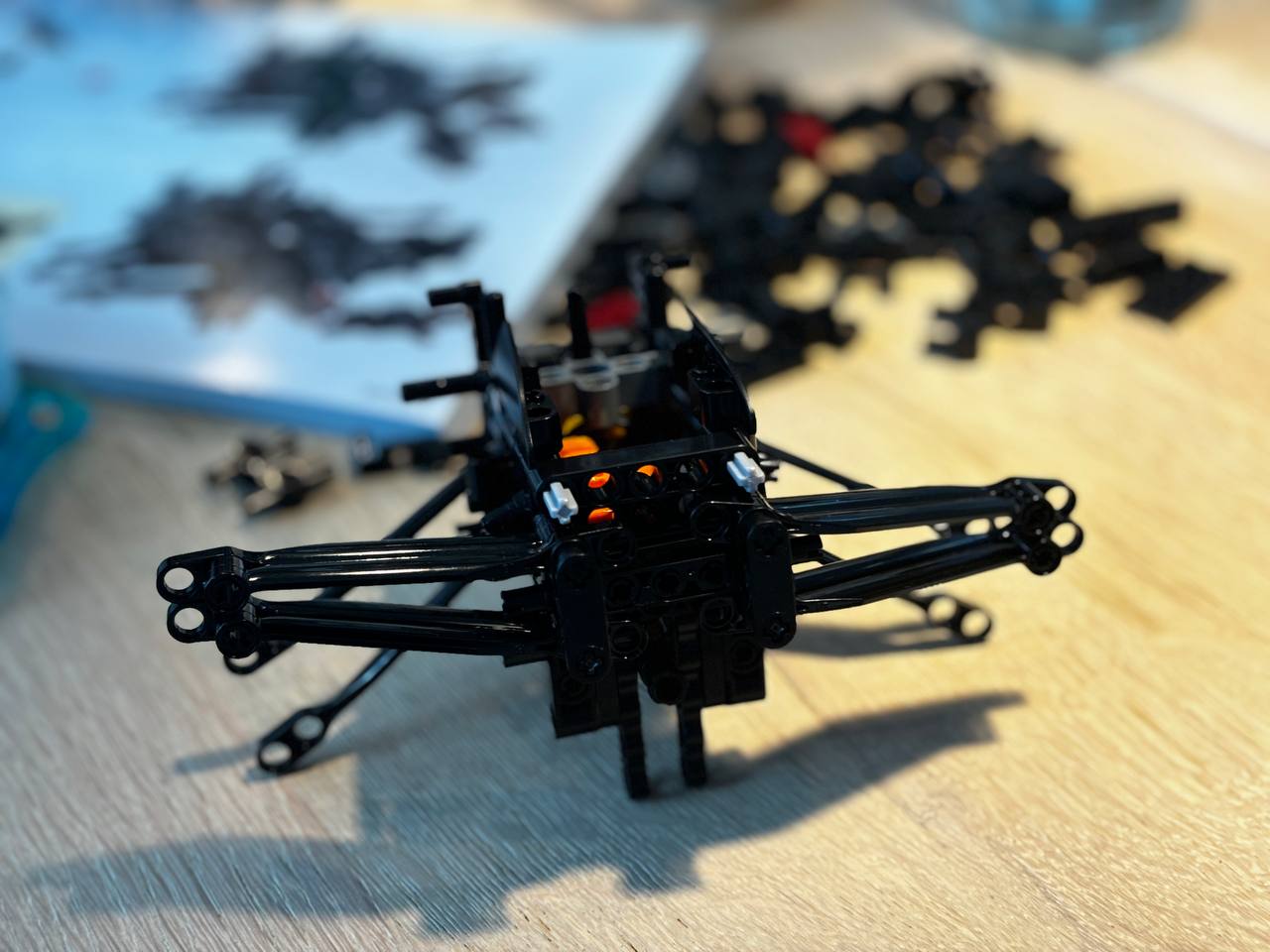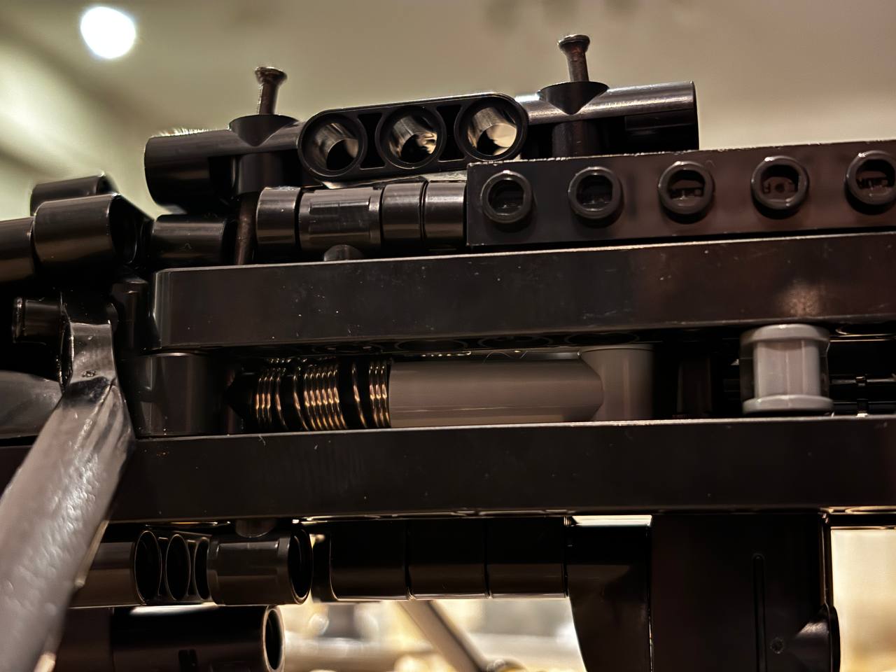 Dadurch werden die Federbeine so weit zusammen gedrückt, dass sie nicht mehr an das durch den grauen Pin fixierte zylindrische Bauteil ragen, sondern sogar hinter den beige-braunen Pin an der äußeren Halte-Konstruktion des Chassis zurück gedrückt werden.