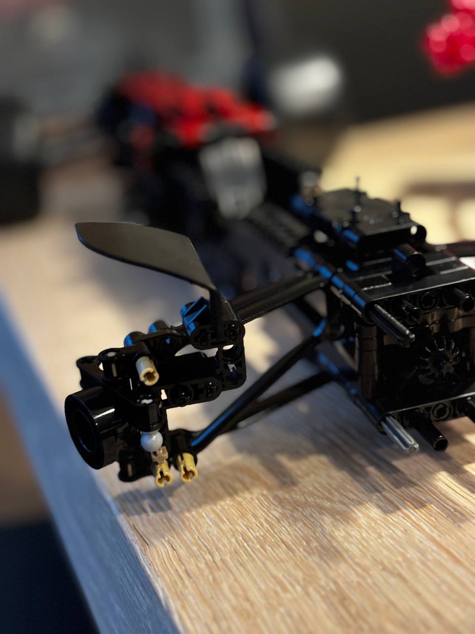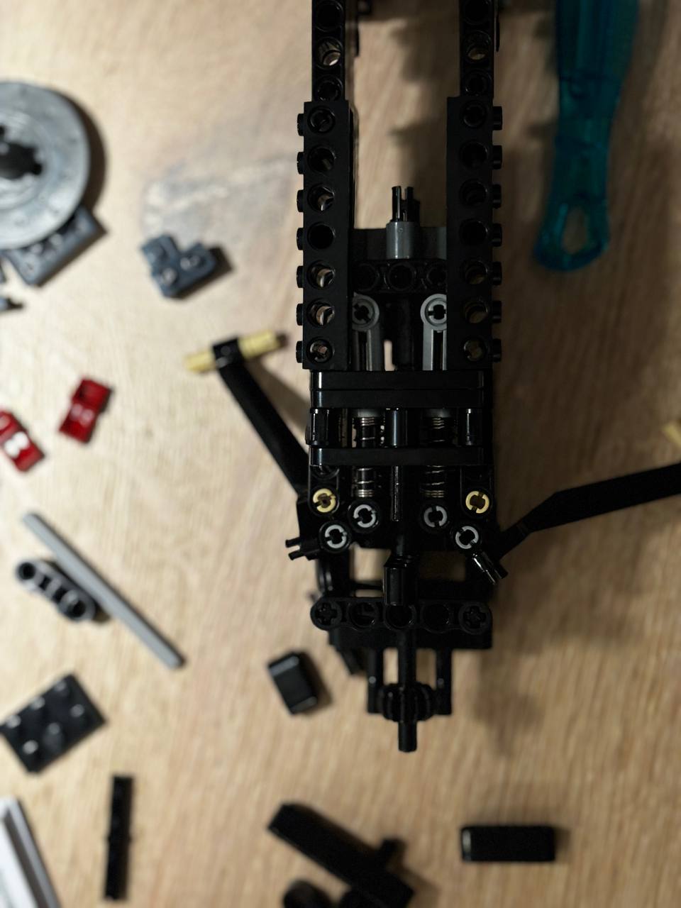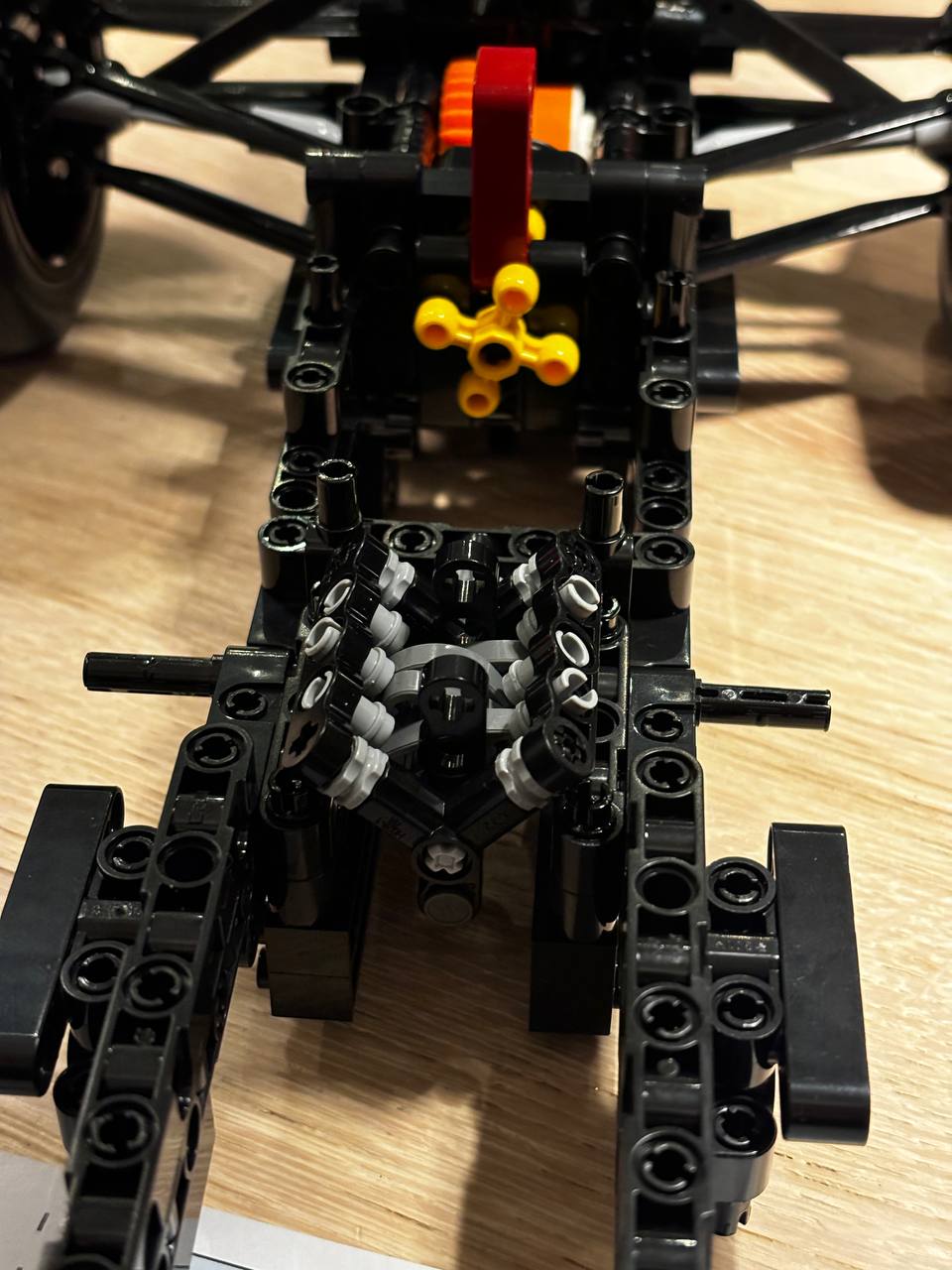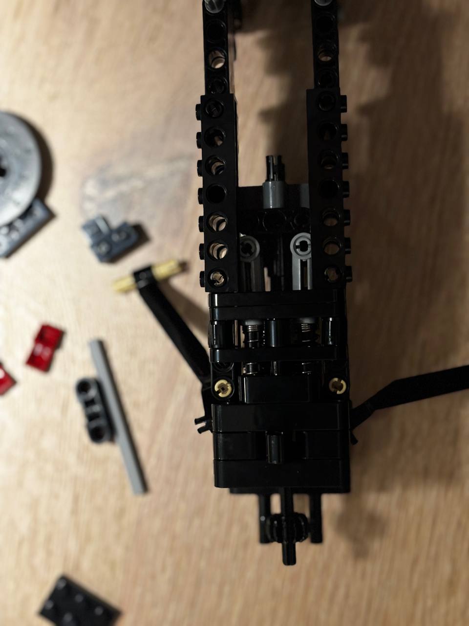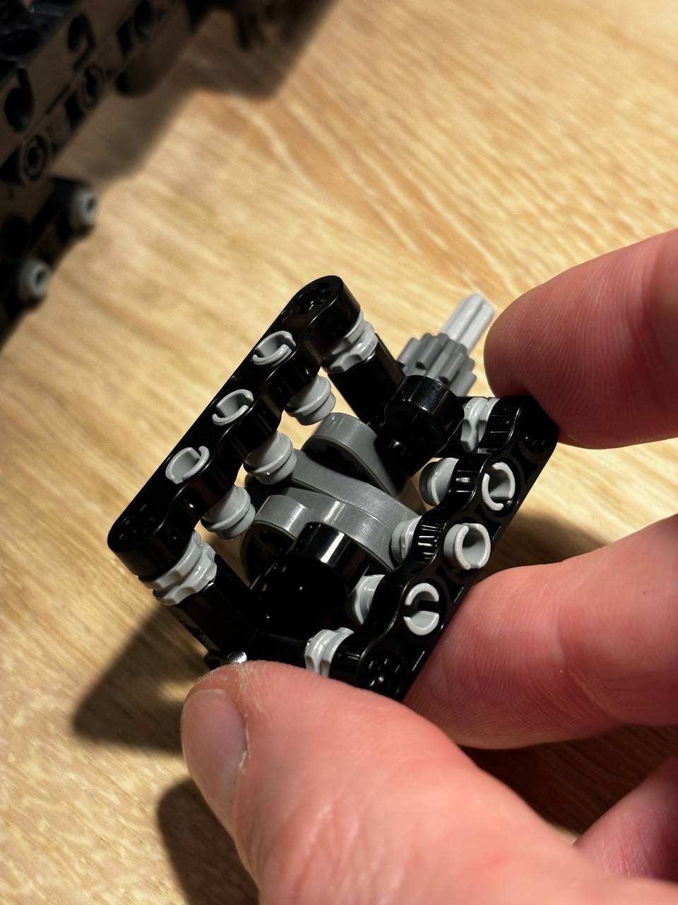 Weiter geht’s mit dem Motor, in dem Fall ein kleiner 6-Zylinder Motor. Der ist hier ohne echte Kolben gebaut, sondern mit kleinen Pins… schaut vielleicht nicht ganz so eindrücklich aus, knattert aber trotzdem beim Bewegen (und sehen kann man den Motor im zusammengebauten Zustand sowieso kaum).