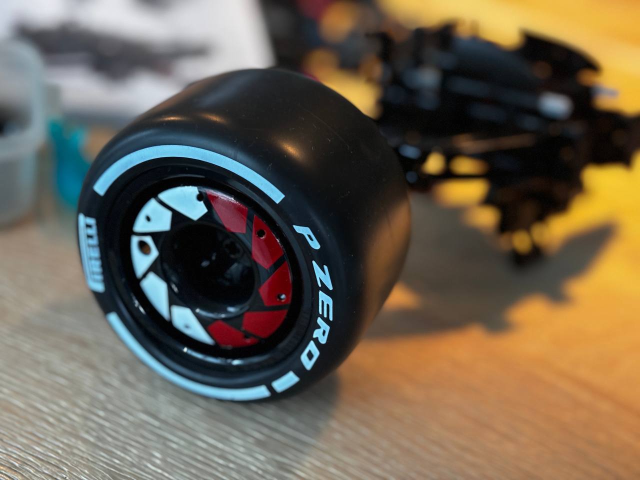 Das Rad bzw. die Räder selber sind aber ein echtes Highlight des Bausatzes: alles aufgedruckt, Spezialfelgen (ebenfalls gedruckt) und echtes weiches Gummi (kein Hartplastik o.ä.) . . . sieht wirklich super aus!