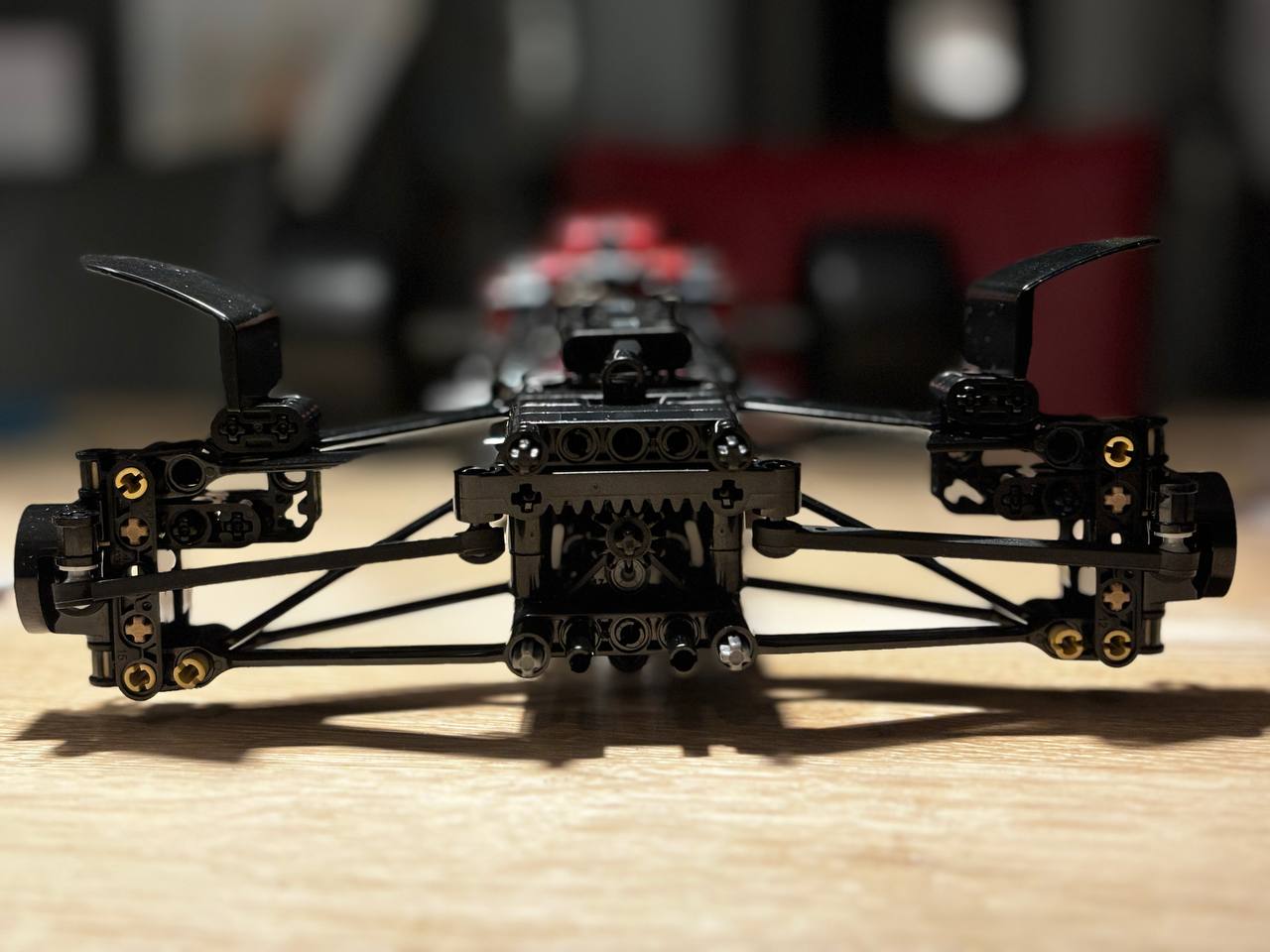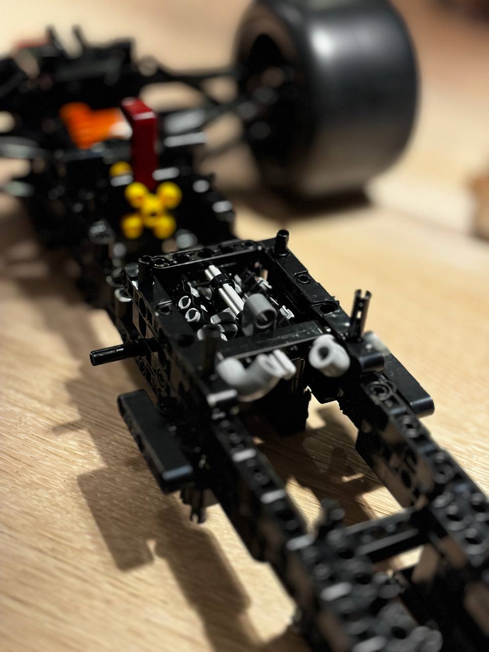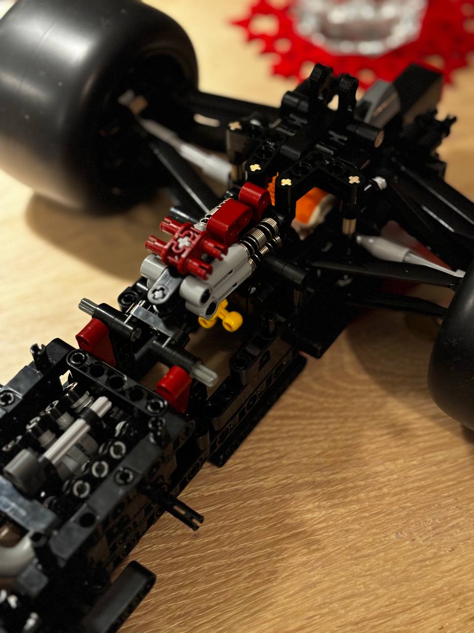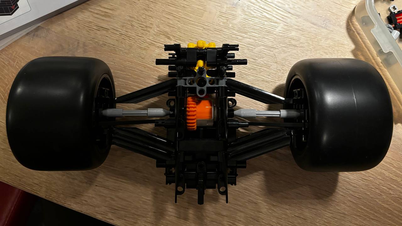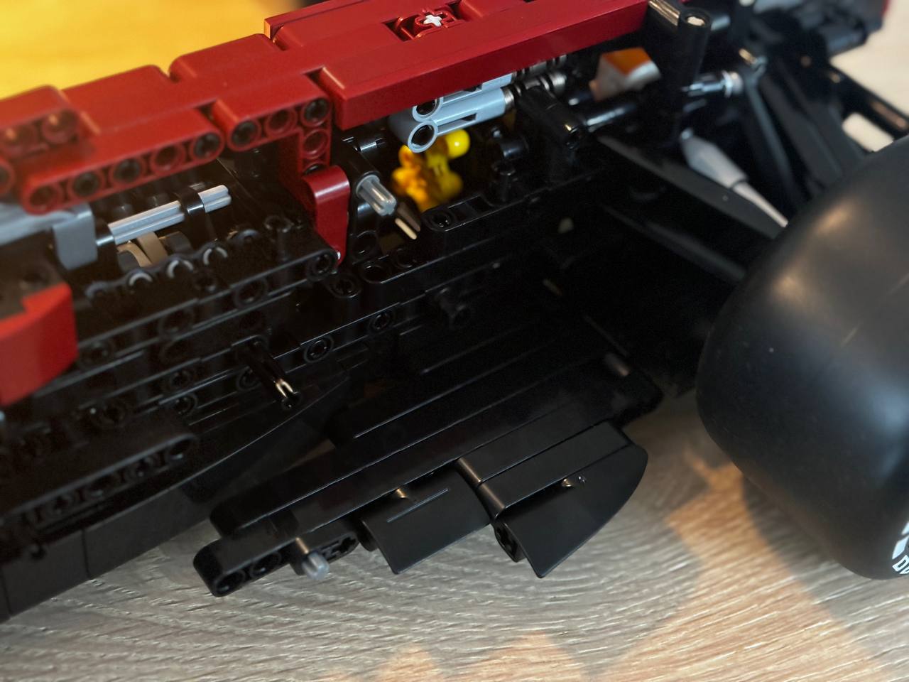 Nun kommen wir zu einer weiteren Besonderheit beim C42 Bausatz, der Federung! Die Federbeine sind (wie im Original) längs eingebaut. Klar, das ist noch nicht sooo besonders ... das eigentlich Besondere ist eher, dass die Federbeine nicht gesteckt / fixiert sind, sondern „nur“ in den Hohlraum hineingelegt und durch Druck auf beweglich montierte Aufhängungselemente komprimiert werden. Bei der Montage der Hinterachse funktioniert das noch relativ gut.