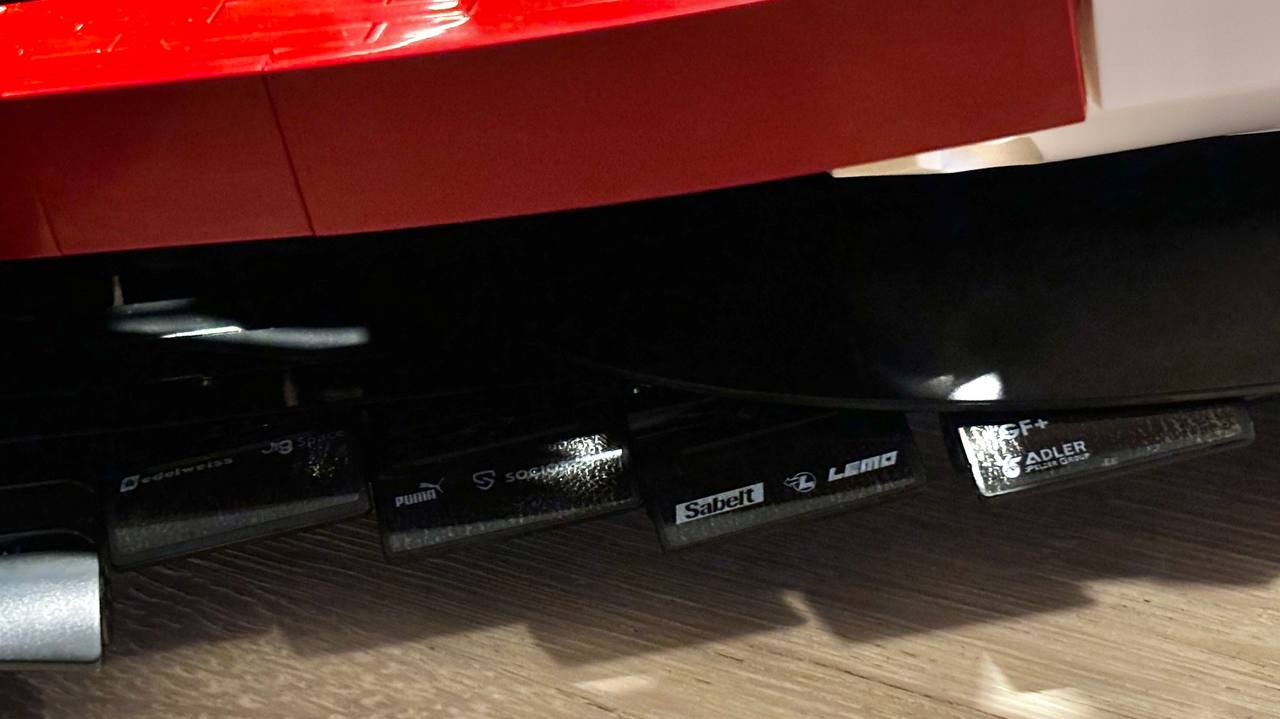 Eigentlich wollte ich ja gar keine der Sticker mit Sponsorenlogos anbringen (bis auf die Alfa Romeo Schriftzüge logischerweise). Die relativ großen schwarzen Flächen des Unterbodens oder auch der Aufhängung kann aber eine optische Unterbrechung gut gebrauchen. Deshalb habe ich dann die etwas dezenteren Sticker auf den großen schwarzen Flächen doch angebracht . . . schaut besser aus.